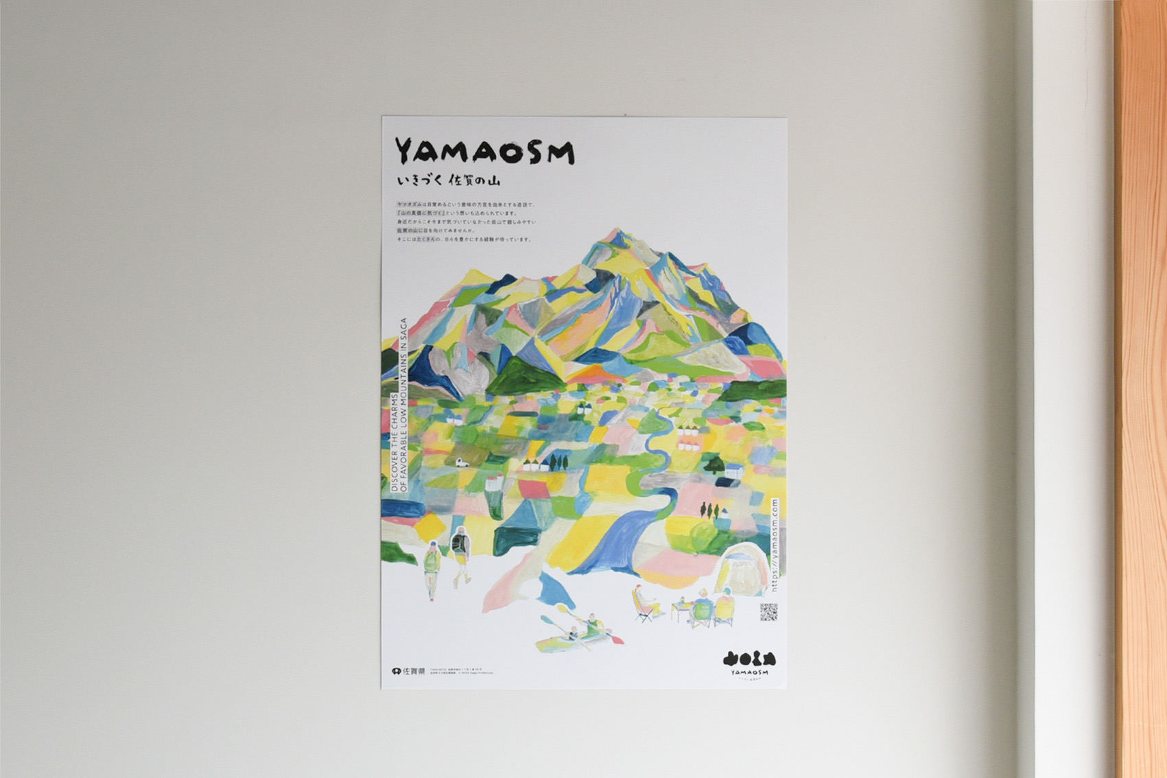 佐賀在住のデザイナー/イラストレーター・宮地明日香さんに絵を描いていただき、YAMAOSMのポスターを制作しました。佐賀県各地の山をモチーフにして稜線を重ね、手書きで描かれたイラストは丁寧かつ繊細で、あざやかな色彩。さりげなくそこには山があり、人々の暮らしがある。